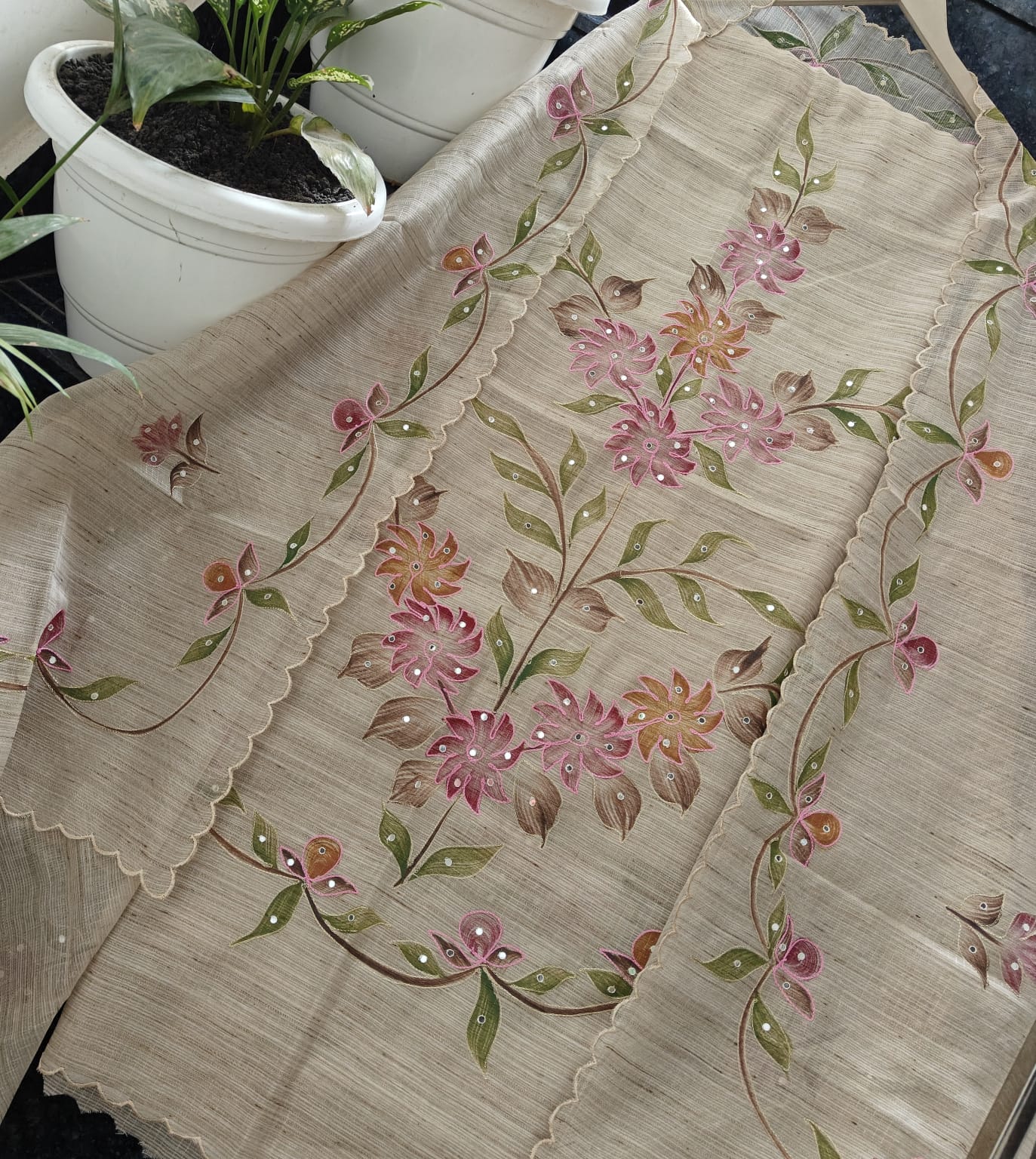 Bring home subtle elegance with this premium unstitched Kota Tissue dress material set in a graceful soft beige, beautifully decorated with hand brush-painted floral motifs. The design is enhanced with delicate mirror highlights and finished with fine hand Aari embroidery outlining, giving it a rich handcrafted look.