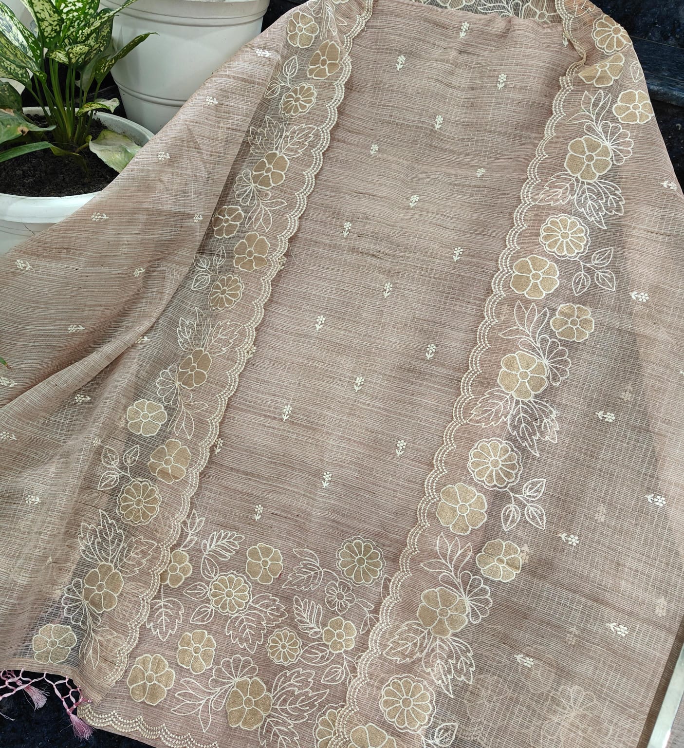 Refresh your ethnic wardrobe with this premium Kota Tissue unstitched dress material set in a beautiful dusty mocha. The highlight of this elegant set is the ivory floral hand applique work crafted in a graceful border pattern, giving it a timeless and sophisticated look.
