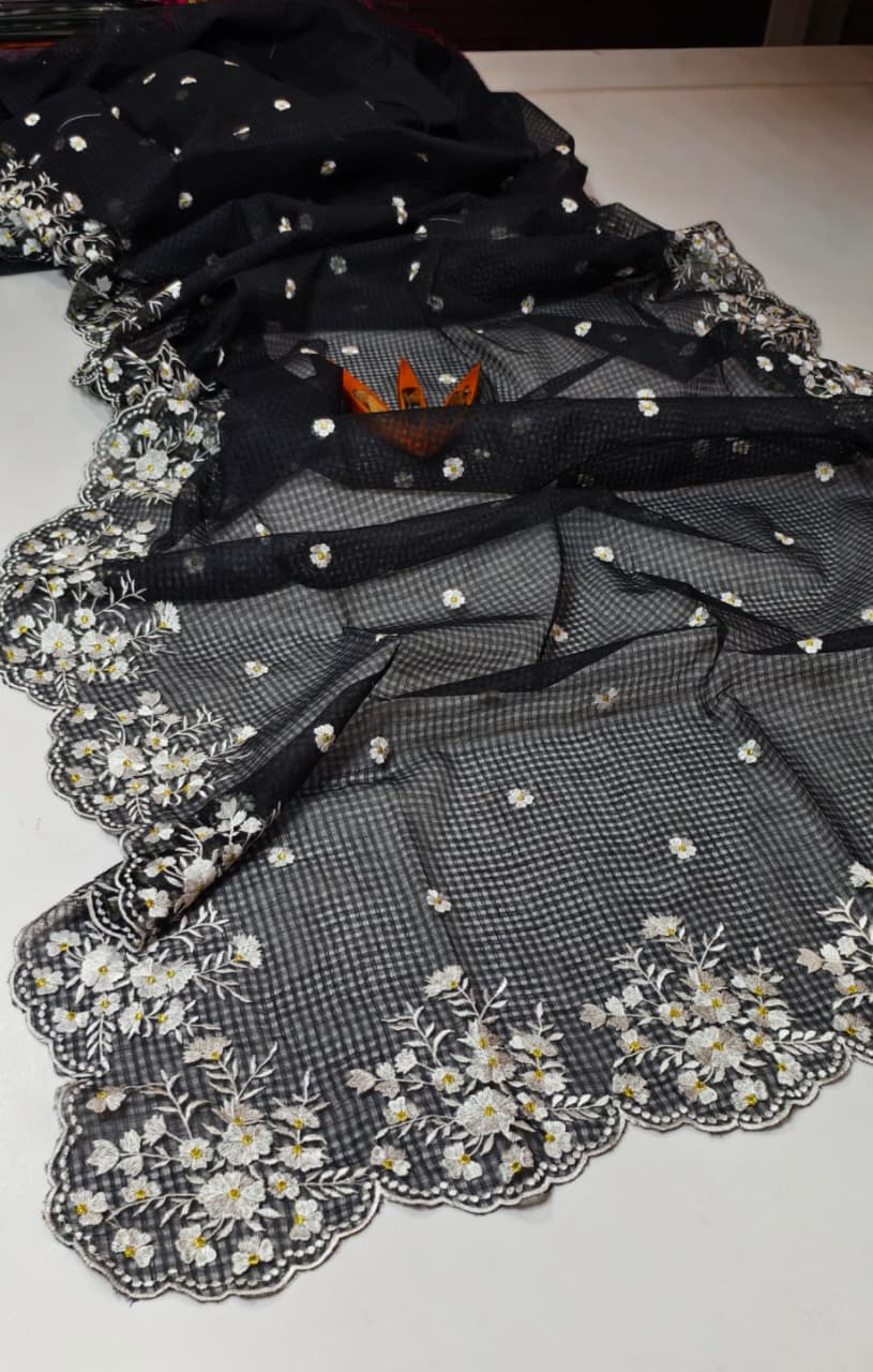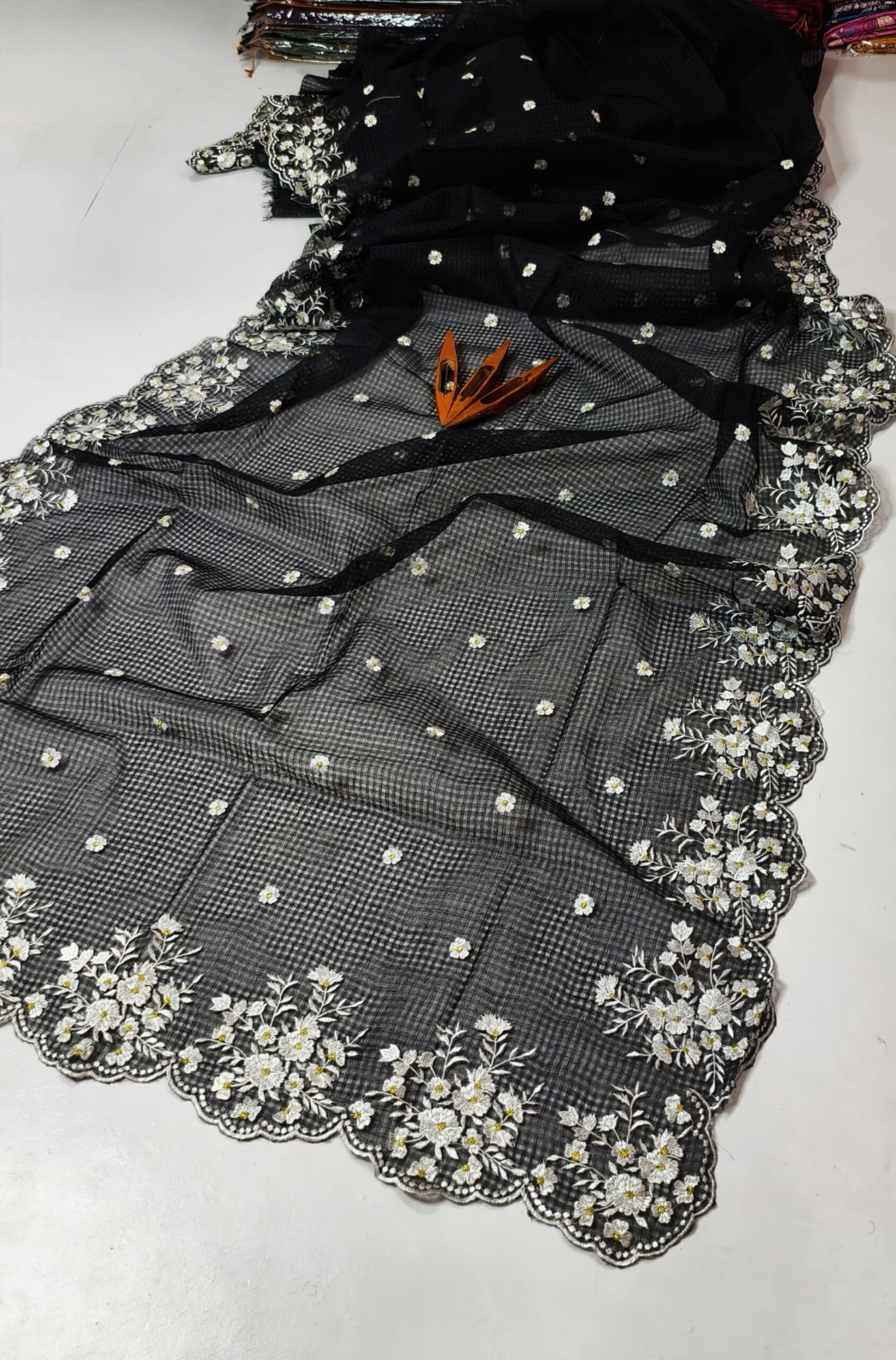 Elegant Black Kota Doria Saree with White Floral Cutwork Hand Embroidery | Designer Party Wear Saree for Women