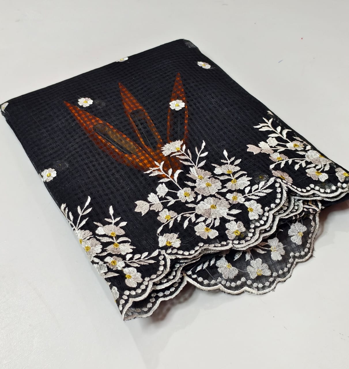 Upgrade your ethnic wardrobe with this graceful Black Kota Doria Saree, beautifully enhanced with intricate all-over hand embroidery and stunning white floral cutwork border detailing. The rich black base creates a bold and sophisticated look, while the delicate white embroidered flowers with subtle golden highlights add timeless elegance.