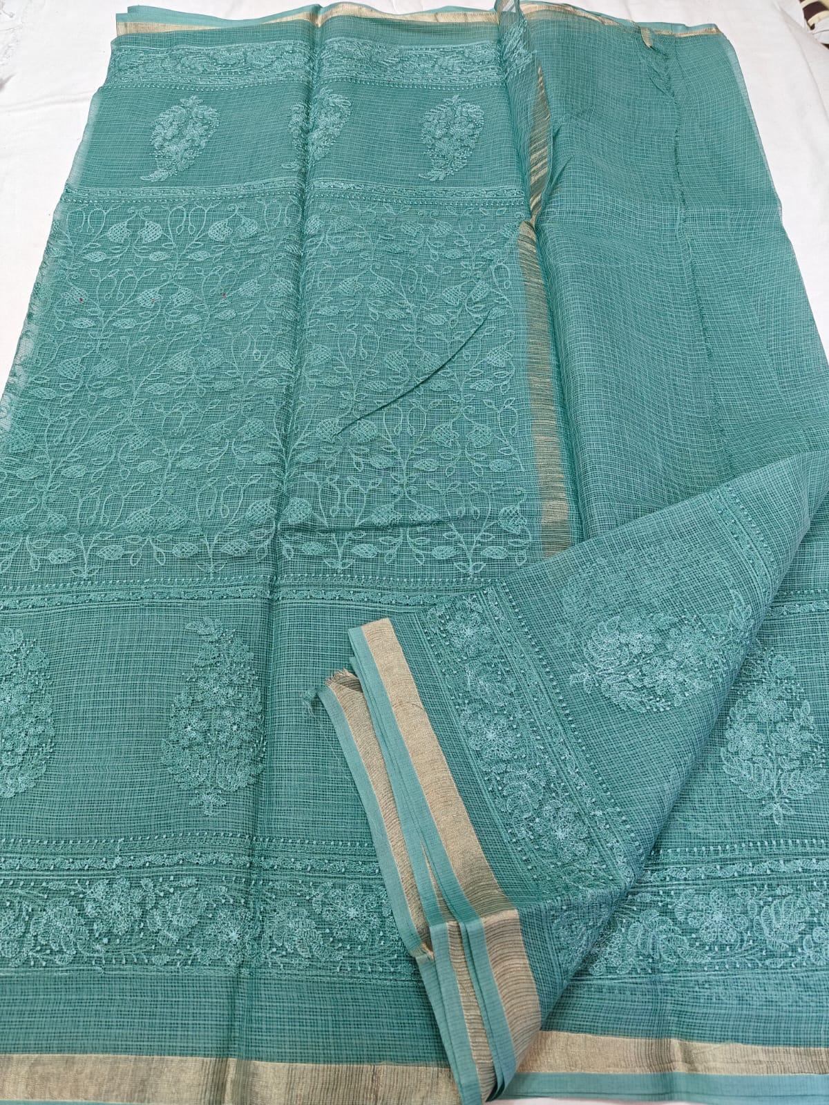 Experience timeless elegance with this pure Kota Doria handcrafted saree, beautifully presented in a serene teal green shade that exudes sophistication and calm charm. The saree is adorned with intricate hand-embroidered paisley and floral motifs, arranged in elegant panels that enhance its rich artisanal appeal.