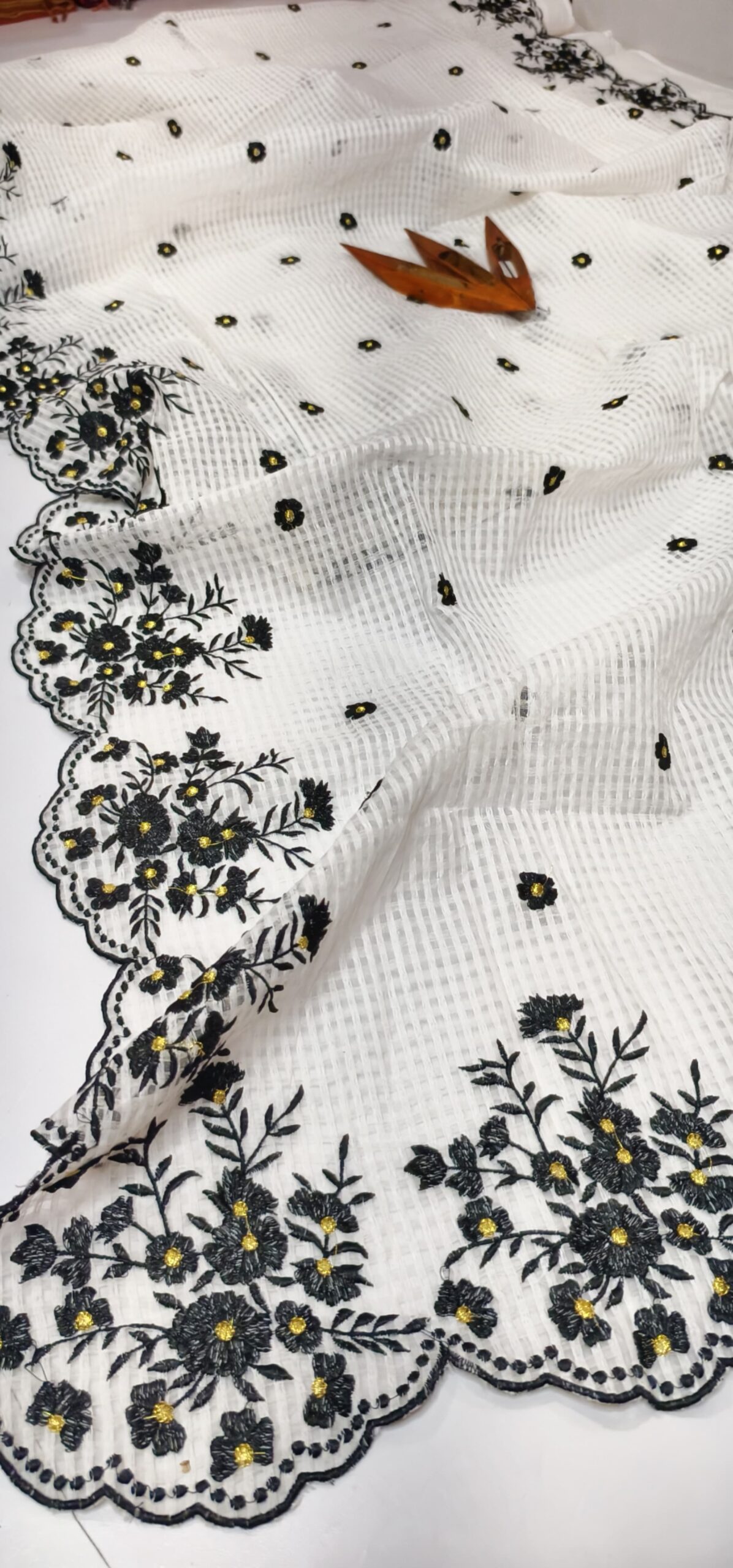 Be the first to review “Elegant White Kota Doria Saree with Black Floral Cutwork Hand Embroidery | Designer Party Wear Saree for Women”