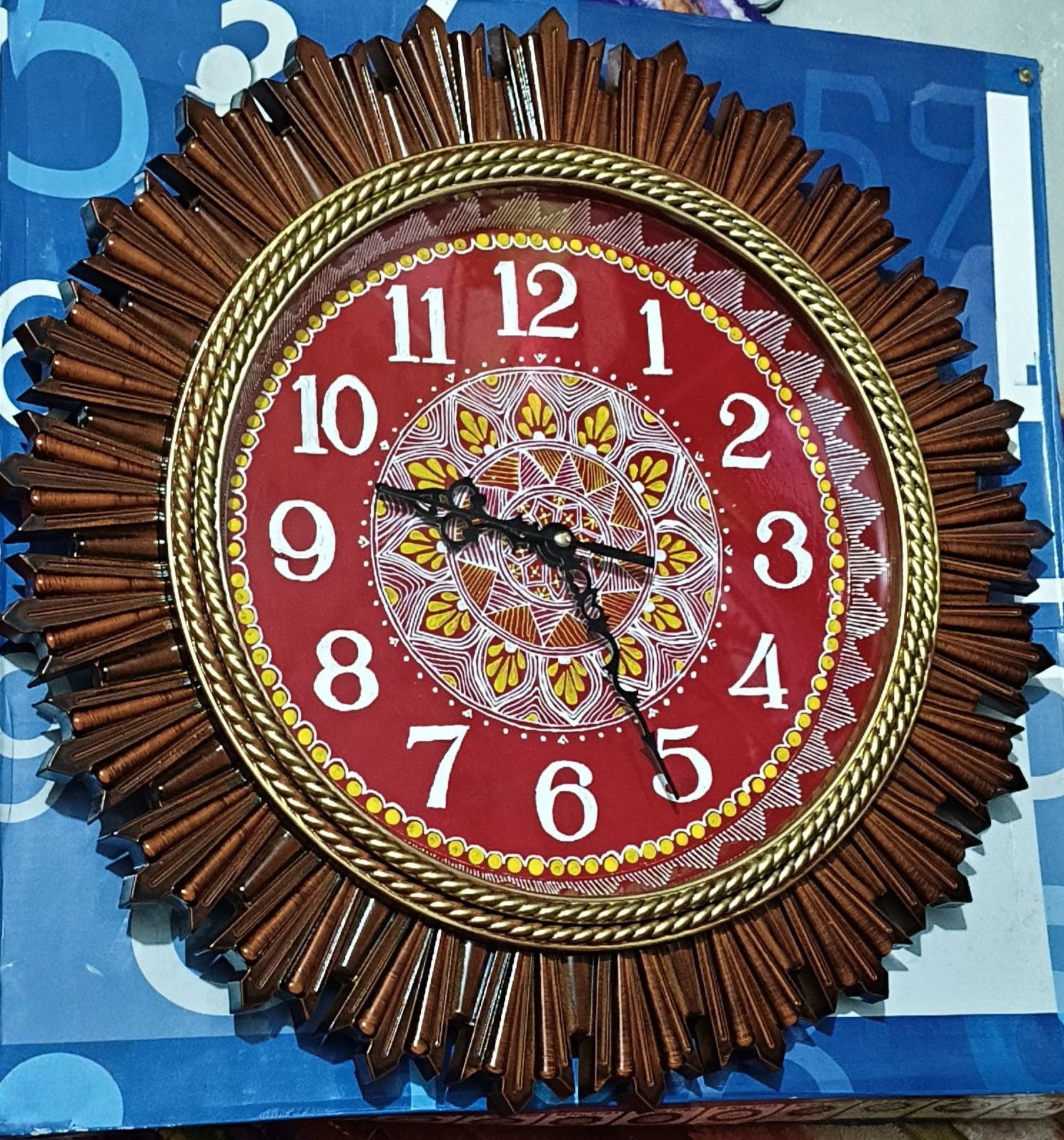 Adorn your wall with this handcrafted fiber clock, beautifully designed in the traditional Aipan art style from Uttarakhand. Measuring 13 inches in diameter, this statement timepiece features a radiant brown sunburst frame and a vibrant red face, embellished with white and yellow mandala motifs for cultural richness and visual appeal. The clock combines heritage artistry and practical function, making it a distinctive centerpiece for your living room, pooja area, or gifting occasions.​​