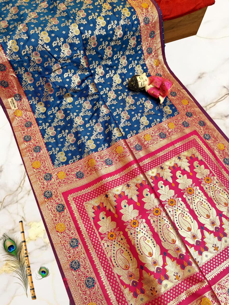 Handcrafted Puri Gazzi Satin Saree in Royal Blue & Rani Pink with Golden Zari Weaving – With Blouse Piece