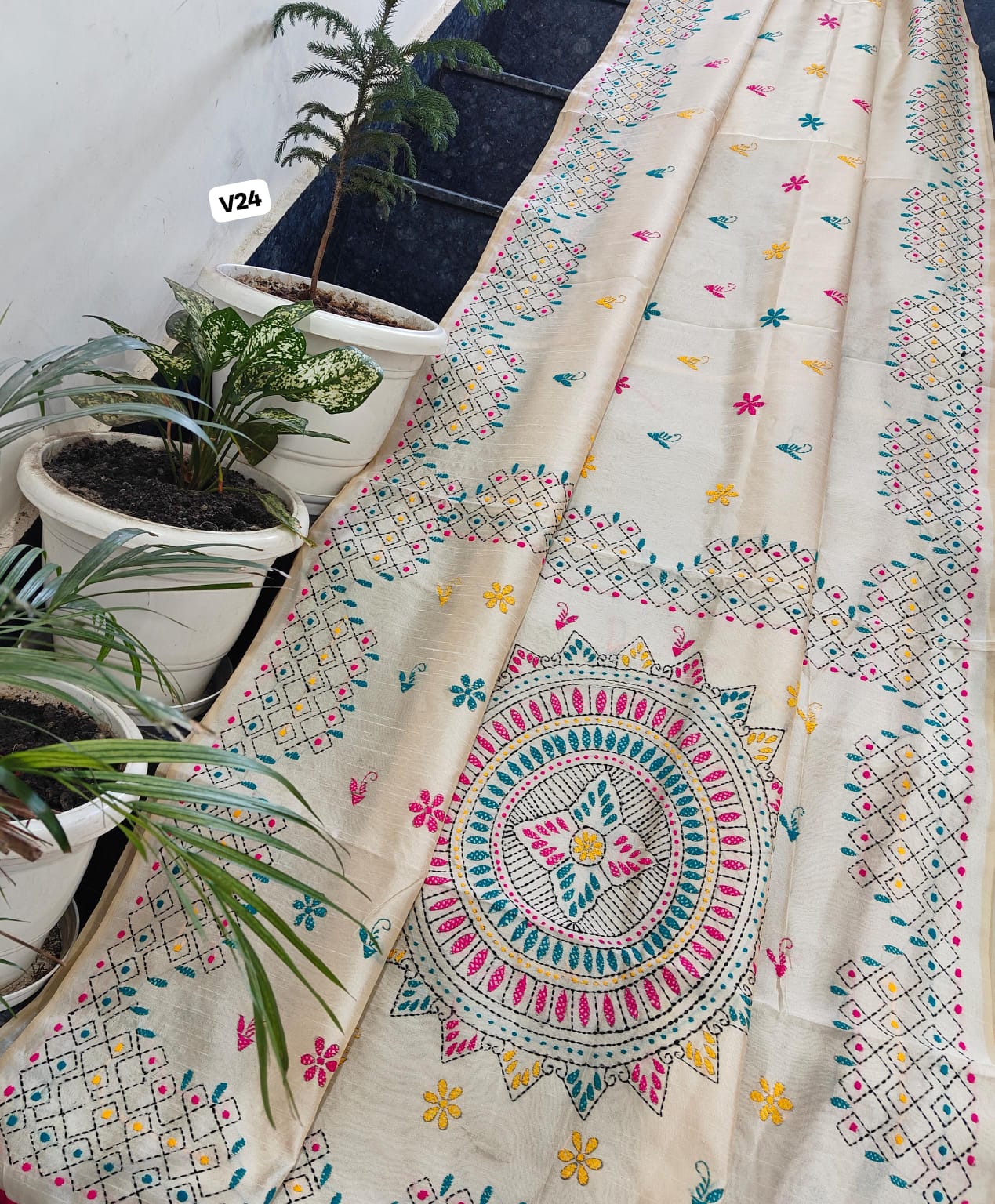 Ivory Bloom Chanderi Hand-Phulkari Saree with Multicolor Mandala Pallu