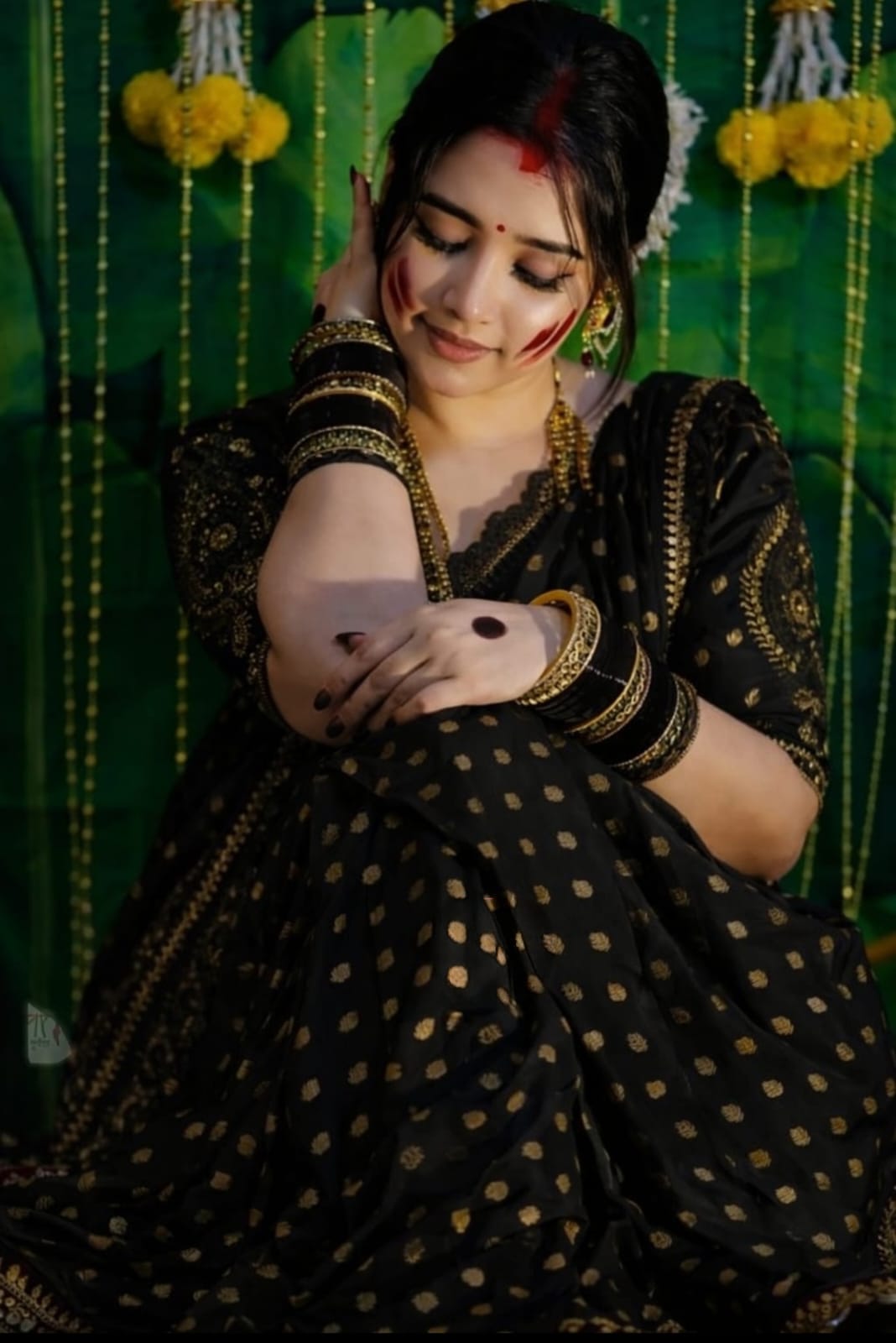 This saree features a deep royal black base beautifully adorned with subtle gold buti motifs, giving it a timeless and luxurious appeal. The richly detailed golden woven border enhances its traditional charm, making it perfect for festive celebrations, wedding functions, evening gatherings, and cultural events.