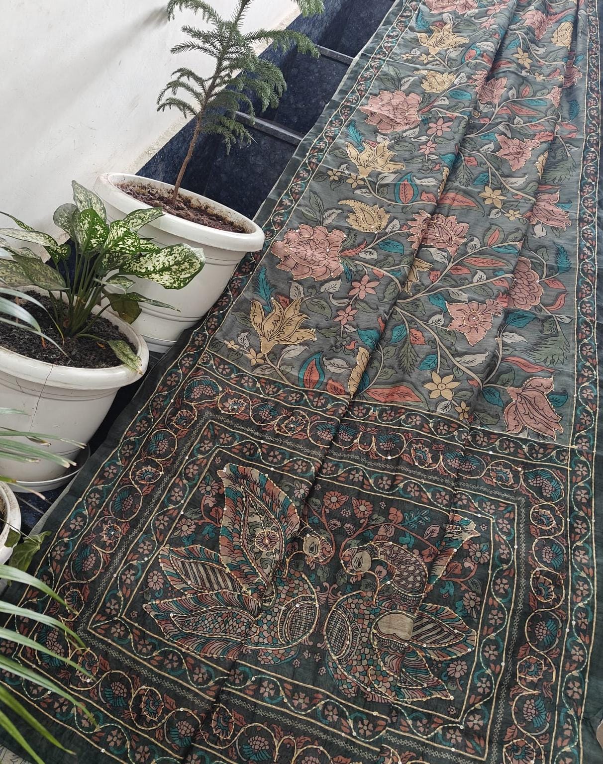 Olive Green Maheshwari Silk Saree with Madhubani Peacock Art & Hand Katha Embroidery