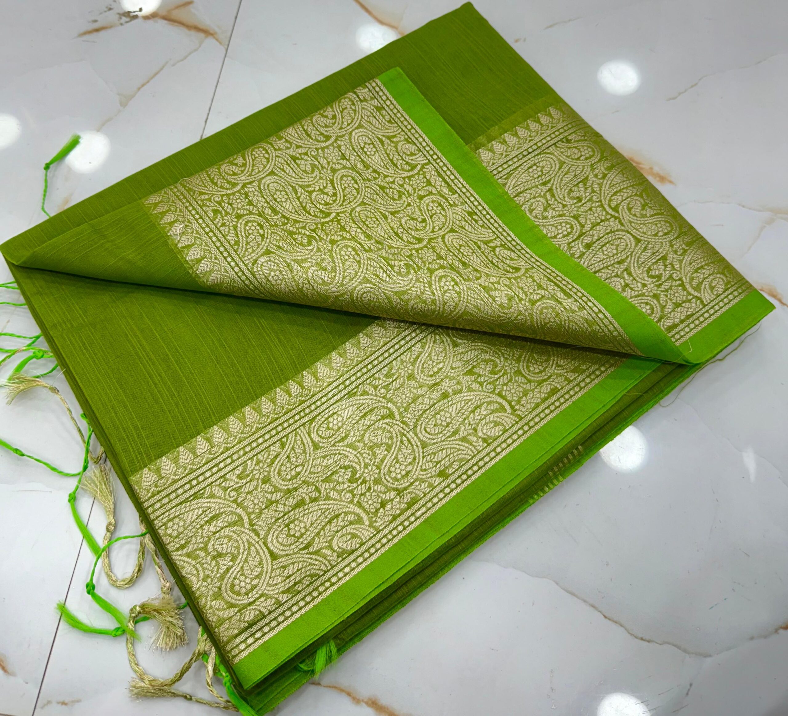 The saree showcases a stunning antique gold woven paisley border and intricately designed pallu, creating a perfect balance of traditional artistry and modern elegance. The bright parrot green body enhances the richness of the golden weaving, making it an ideal choice for festivals, weddings, cultural celebrations, and special occasions.