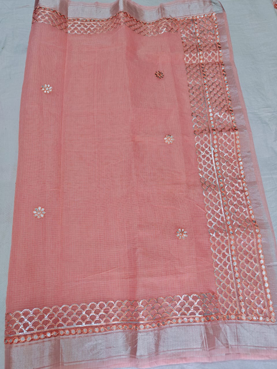 Peach Kota Doria Saree with Silver Zari Border & Gota Patti Handwork | Running Blouse Included | Free Size