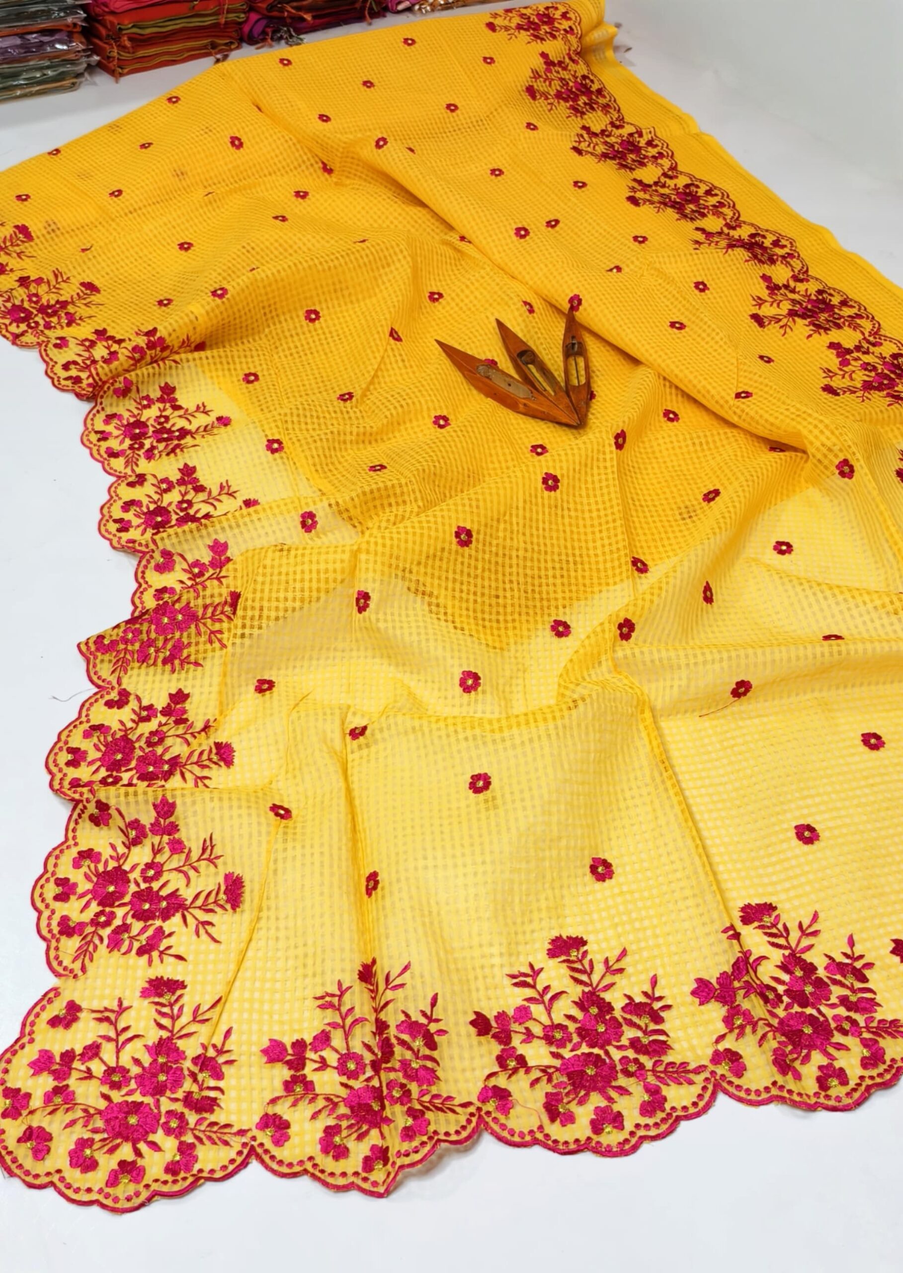 righten your ethnic wardrobe with this stunning Yellow Kota Doria Saree, beautifully designed with intricate all-over hand embroidery and elegant pink floral cutwork border detailing. The vibrant yellow base paired with rich pink floral threadwork creates a fresh, festive, and eye-catching combination perfect for special occasions.