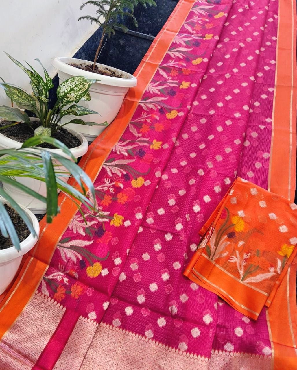 Rani Pink Kota Doria Soft Silk Saree with Butti Weave & Floral Border + Orange Contrast Blouse