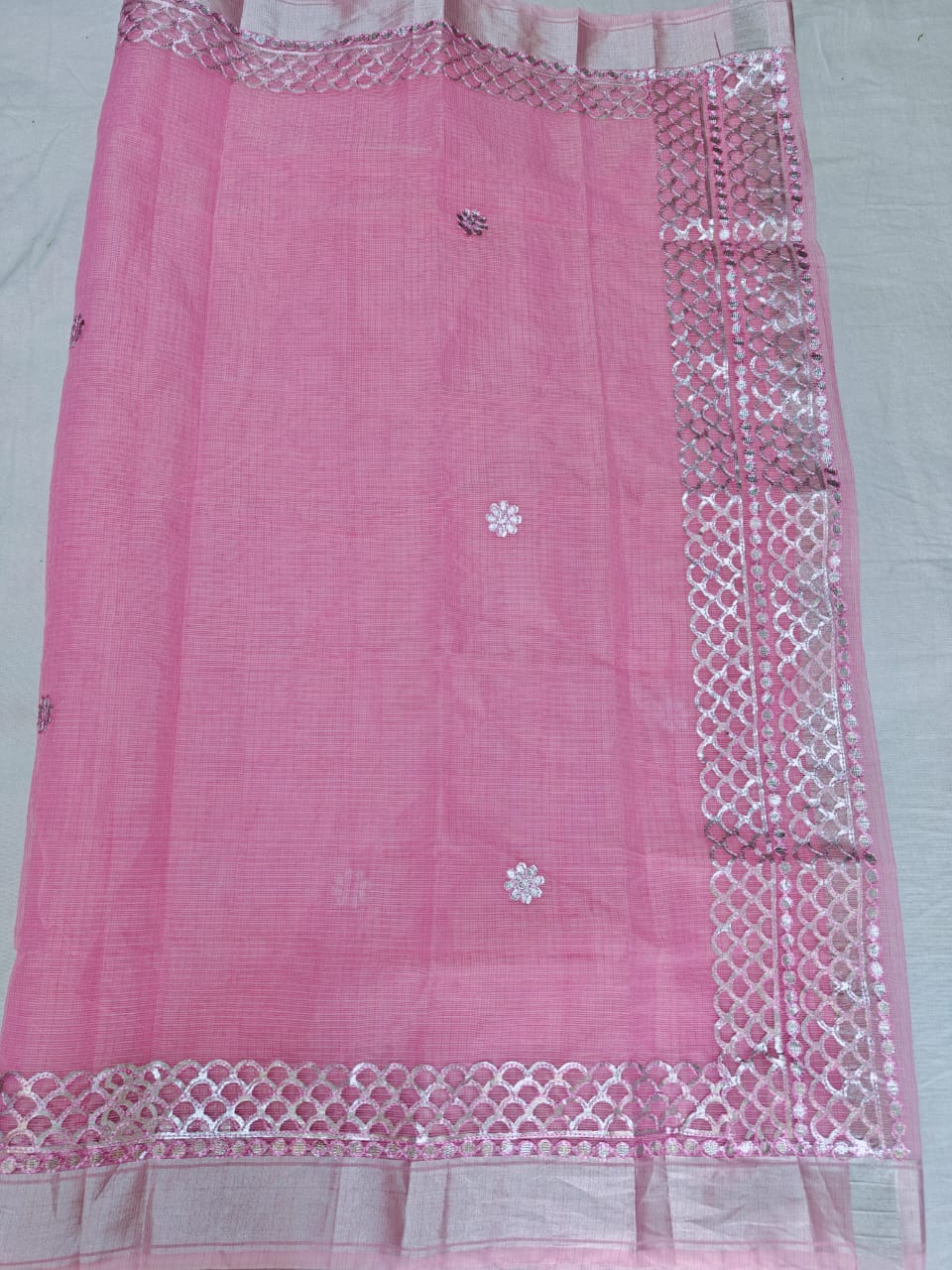 Rose Pink Kota Doria Saree with Silver Zari Border & Gota Patti Handwork | Running Blouse Included | Free Size