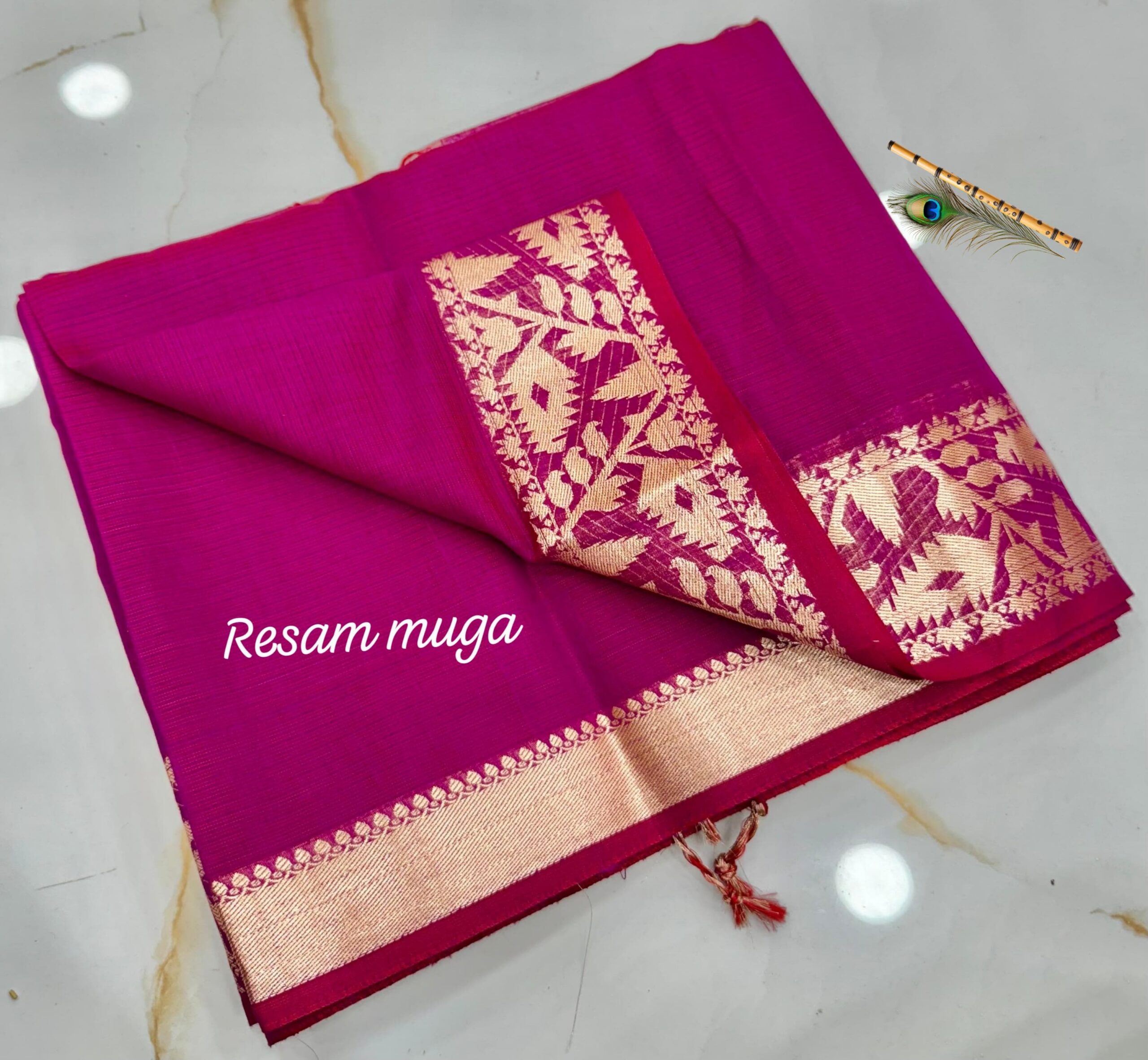 Crafted from authentic Pure Muga Silk, the fabric has a natural sheen, smooth texture, and lightweight fall that ensures graceful draping. The rich contrast of vibrant magenta and shimmering gold makes it an ideal choice for weddings, festive celebrations, cultural events, and special occasions.