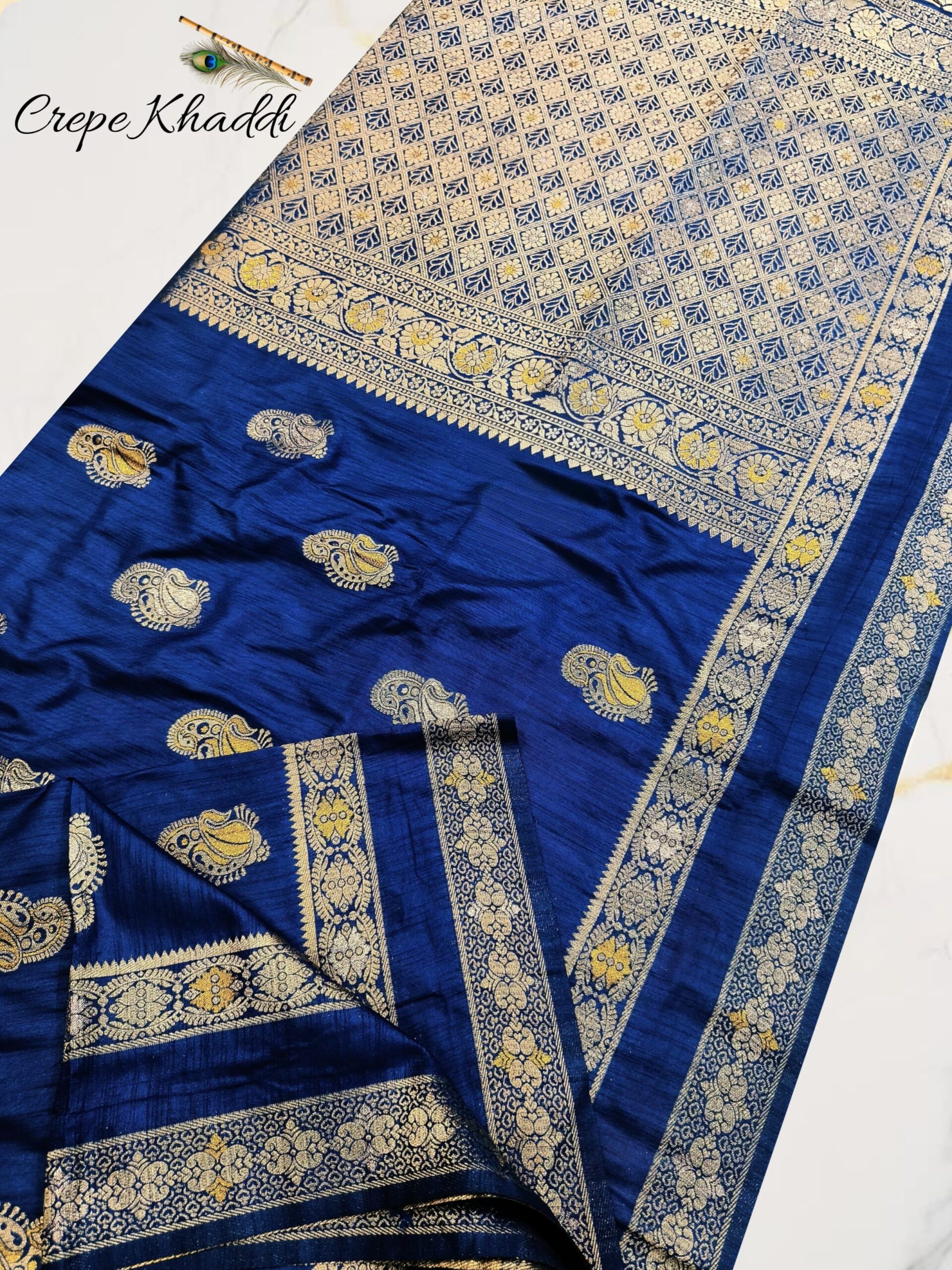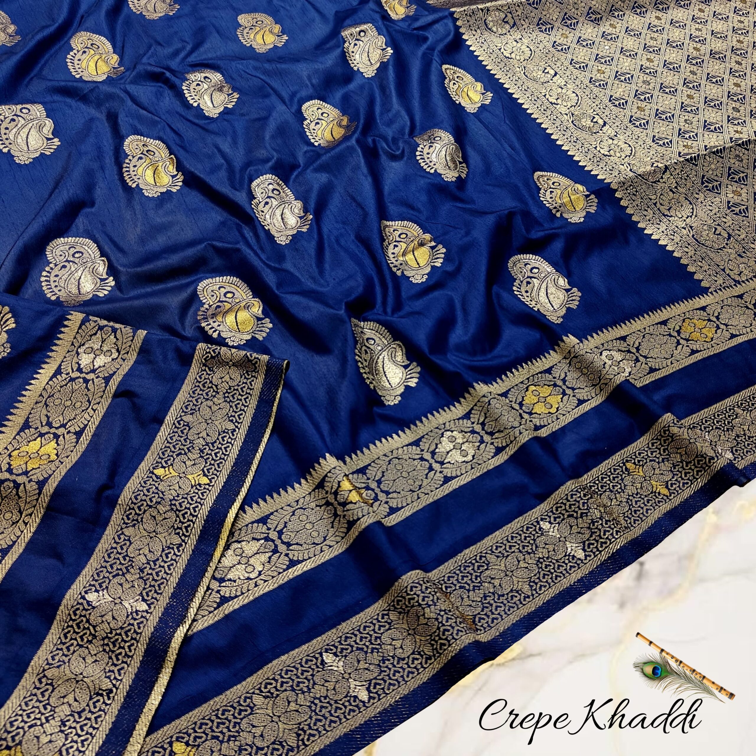 Indulge in pure elegance with this Premium Khaddi Silk Saree in a rich royal navy blue hue, exquisitely adorned with all-over Minakari handwork. Crafted from buttery-soft Khaddi silk, this saree offers a graceful drape with a luxurious feel, making it perfect for weddings, festive celebrations, and heritage occasions.