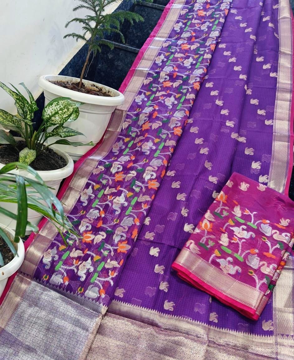 Royal Purple Kota Doria Soft Silk Saree with Silver Butti Weave & Multicolor Elephant Border + Magenta Contrast Blouse