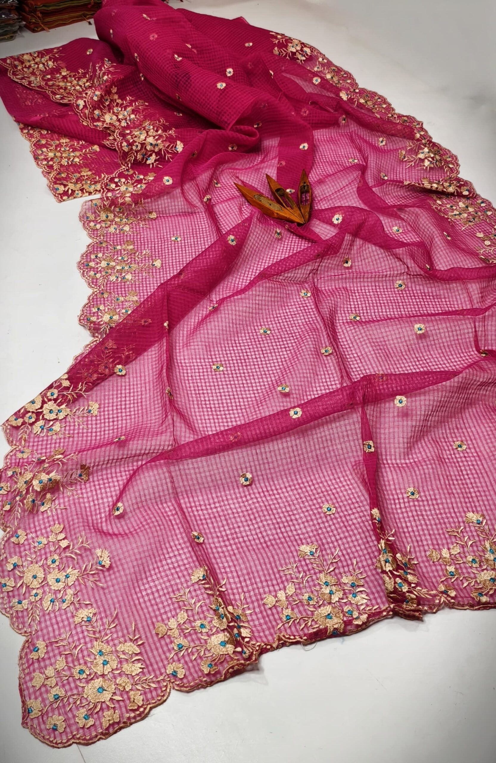 Enhance your ethnic style with this stunning Rani Pink Kota Doria Saree, beautifully designed with intricate all-over hand embroidery and luxurious golden floral cutwork border detailing. The vibrant rani pink base paired with elegant golden floral threadwork and subtle blue accents creates a rich and graceful festive look.