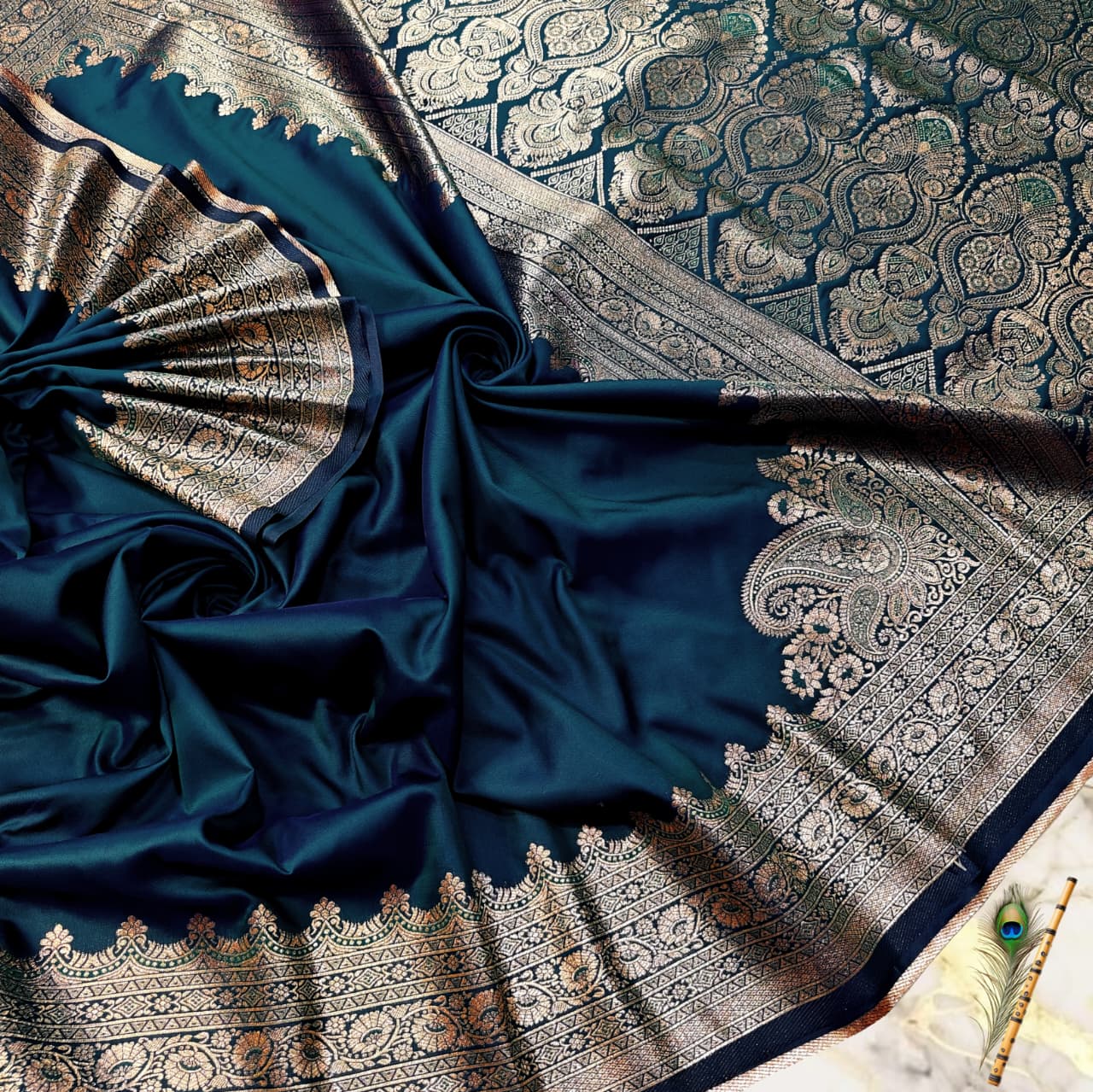 Bring home timeless luxury with this handcrafted dual-tone premium satin saree featuring a stunning royal teal blue glossy finish. The elegant dual-tone satin body reflects light beautifully, creating a rich, sophisticated look perfect for grand occasions.