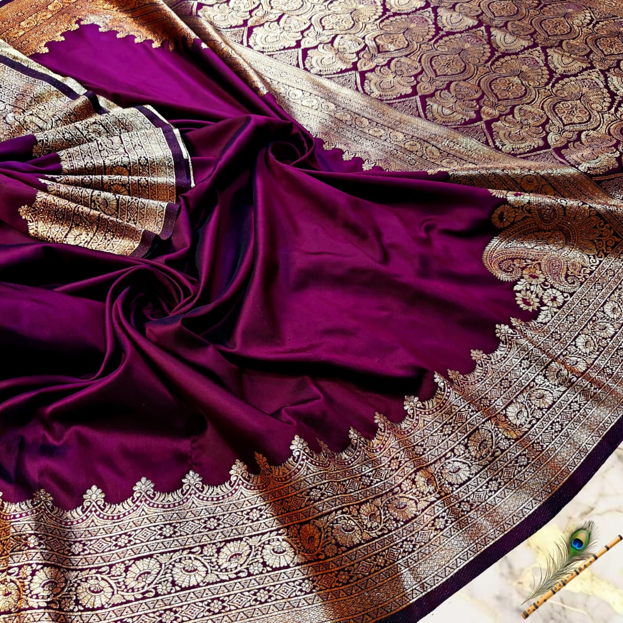 Elevate your ethnic wardrobe with this luxurious handcrafted dual-tone premium satin saree designed for timeless elegance and festive grandeur. Featuring a rich wine-purple glossy satin body, this saree reflects subtle dual-tone shine that changes beautifully with light, giving it a royal and premium appeal.