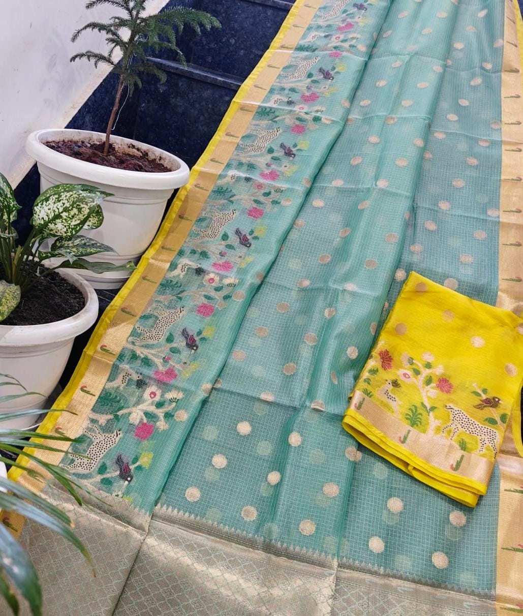 Sea Green Kota Doria Soft Silk Saree with Gold Butti Weave & Forest Animal Border + Yellow Contrast Blouse