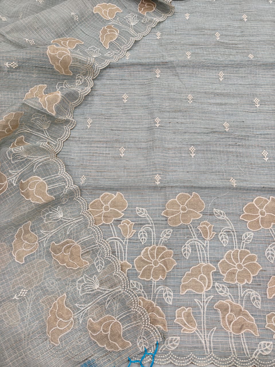 Add a fresh pastel charm to your ethnic wardrobe with this premium Kota Tissue unstitched dress material set in a soothing steel blue. The highlight of this set is the elegant beige floral hand applique work with fine outlining, beautifully placed along the border for a graceful and classy look.